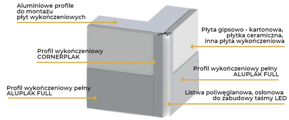 ALUPLAK CORNERPLAK to jedyna dostępna na rynku listwa wykończeniowa, dzięki której zabezpieczysz narożniki w użytkowanych pomieszczeniach. CORNERPLAK pozwala na montaż oświetlenia LED, tworząc komfortowe otoczenie dzięki zastosowaniu oświetlenia pośredniego.