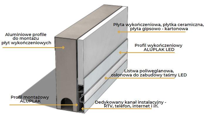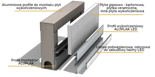 Składa się z dwóch części – profilu montażowego oraz profilu wykończeniowego ALUPLAK LED – listwa wykończeniowa LED z dedykowanym kanałem instalacyjnym na taśmę led.