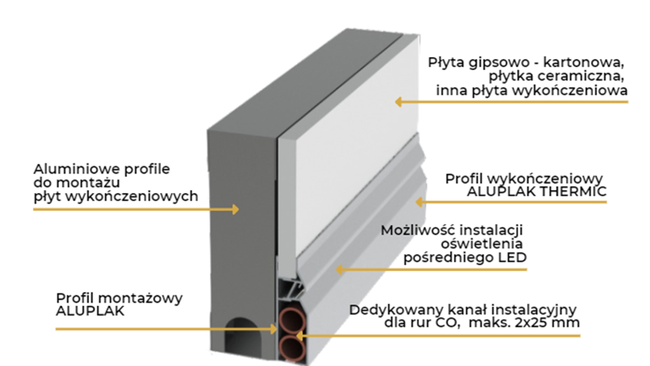 Idealne połączenie ALUPLAK z grzejnikiem, bez zużywania energii, dzięki możliwości prowadzenia miedzianych rur instalacji CO wewnątrz ALUPLAK THERMIC.