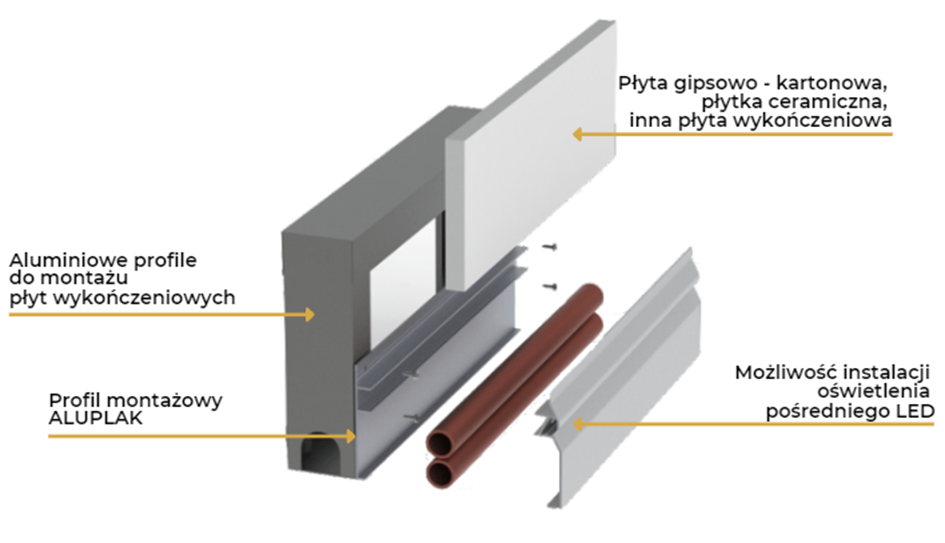 Powiększenie kanału instalacyjnego w porównaniu do ALUPLAK FULL i ALUPLAK LED, umożliwia prowadzenie wewnątrz, dwóch rurek, o średnicy do 25 mm.